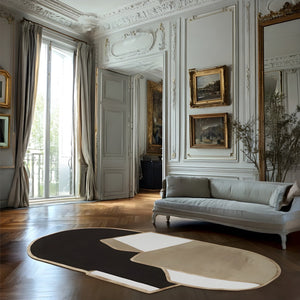 Son contour librement dessiné et ses blocs de couleurs contrastés — beige, ivoire et noir profond — rappellent une œuvre picturale contemporaine. Les lignes ne cherchent pas la perfection : elles traduisent le geste, la spontanéité et la matière, comme une toile abstraite qui dialogue avec l’espace.