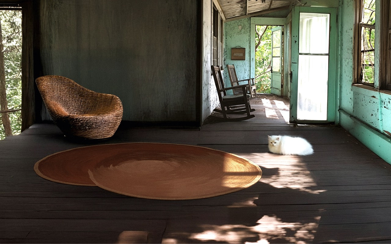 Ses nuances chaudes – rouille, brun et taupe – s’entrelacent délicatement, comme sculptées par la lumière. Chaque courbe reflète le mouvement naturel du geste artisanal, transformant le tapis en une véritable pièce d’art pour le sol.