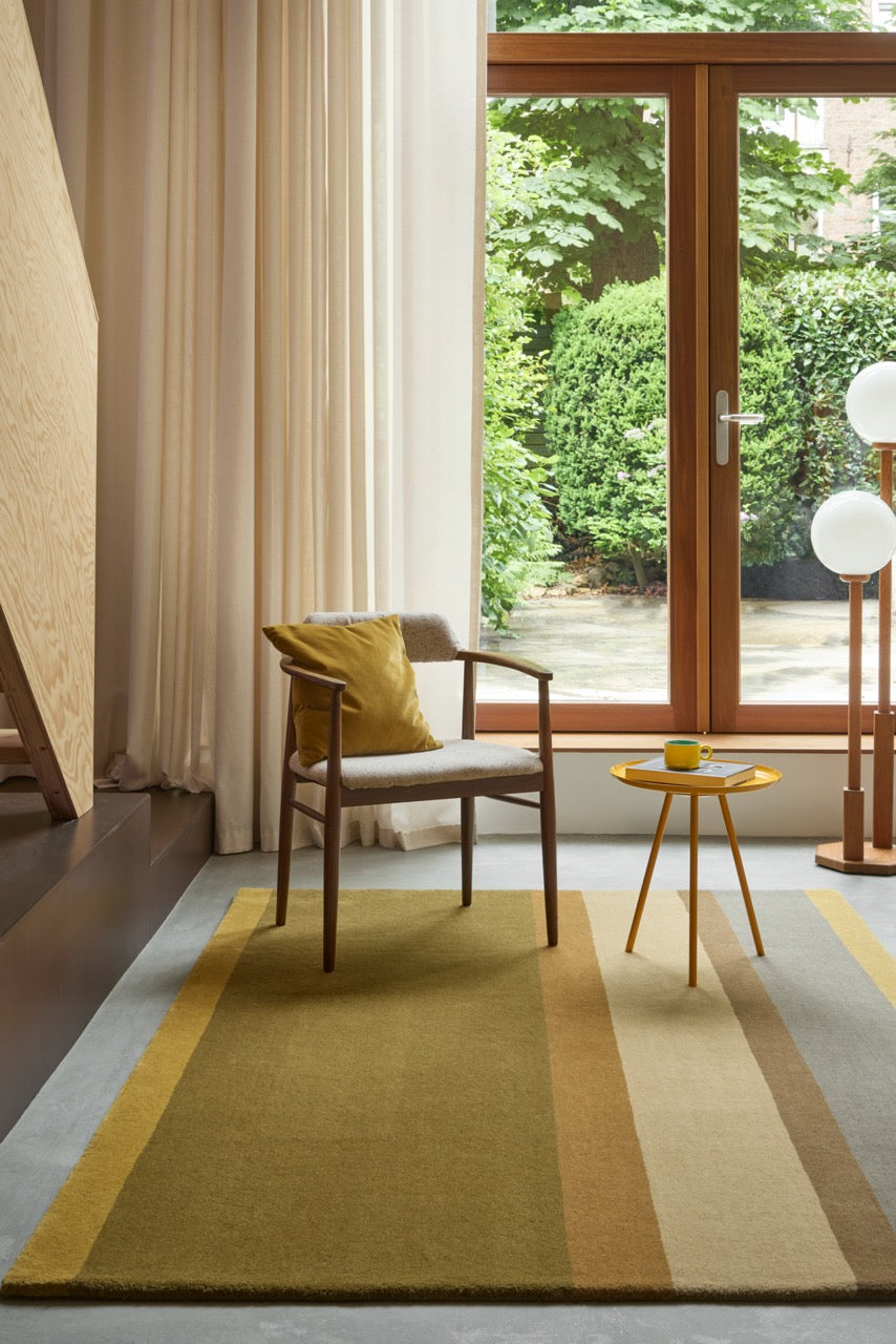 Le Linear Earth trouve parfaitement sa place dans un salon contemporain avec du mobilier en bois clair ou des textiles en lin, où ses rayures naturelles créent une atmosphère apaisante. Dans une chambre, il instaure une ambiance cocooning et élégante. Il peut également servir de pièce centrale sous une table à manger ou dans un espace lounge.