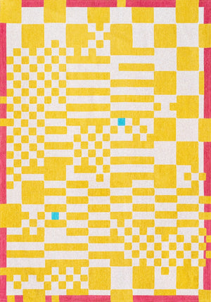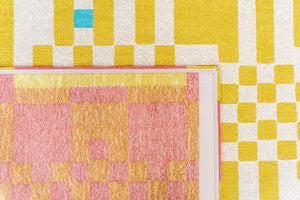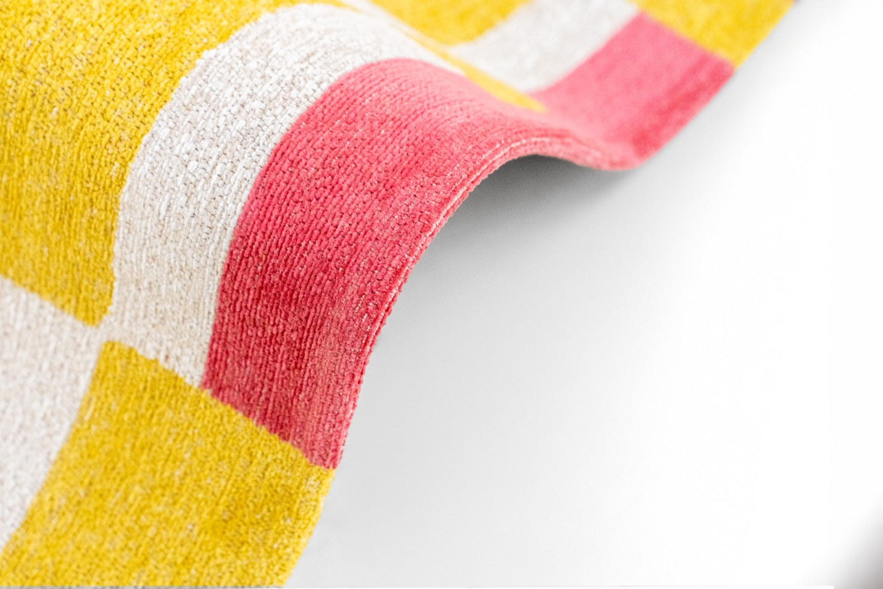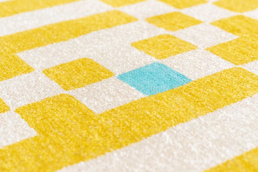 Le jaune lumineux structure l’ensemble, adouci par une base ivoire qui équilibre la composition. De légers accents de rose et de turquoise viennent ponctuer le dessin avec discrétion, apportant une touche contemporaine et subtilement inattendue.