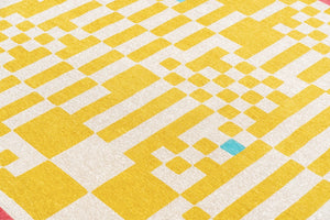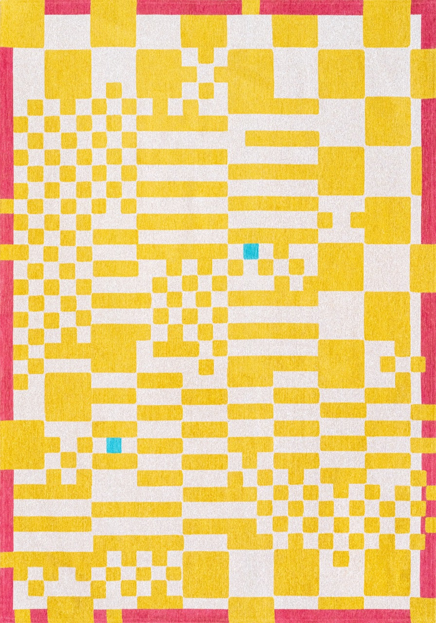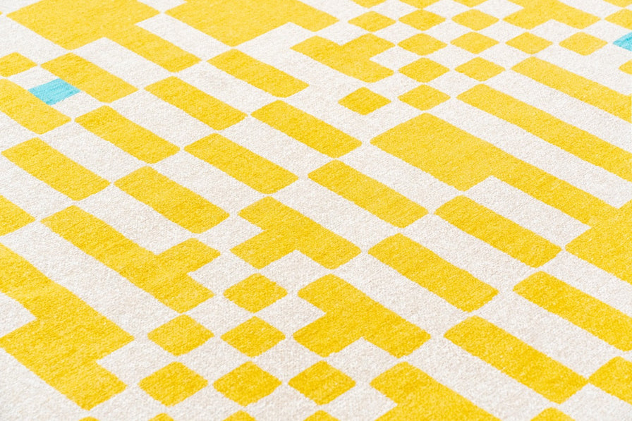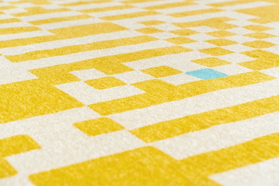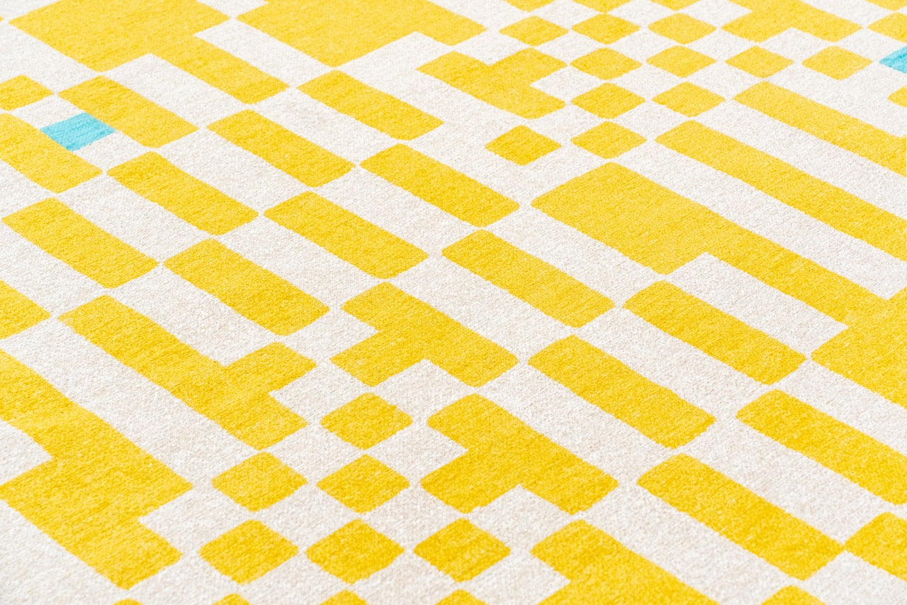 De près, le tapis dévoile une structure presque graphique, évoquant un maillage précis. En prenant du recul, cette rigueur s’efface pour laisser place à une lecture plus fluide, presque abstraite.