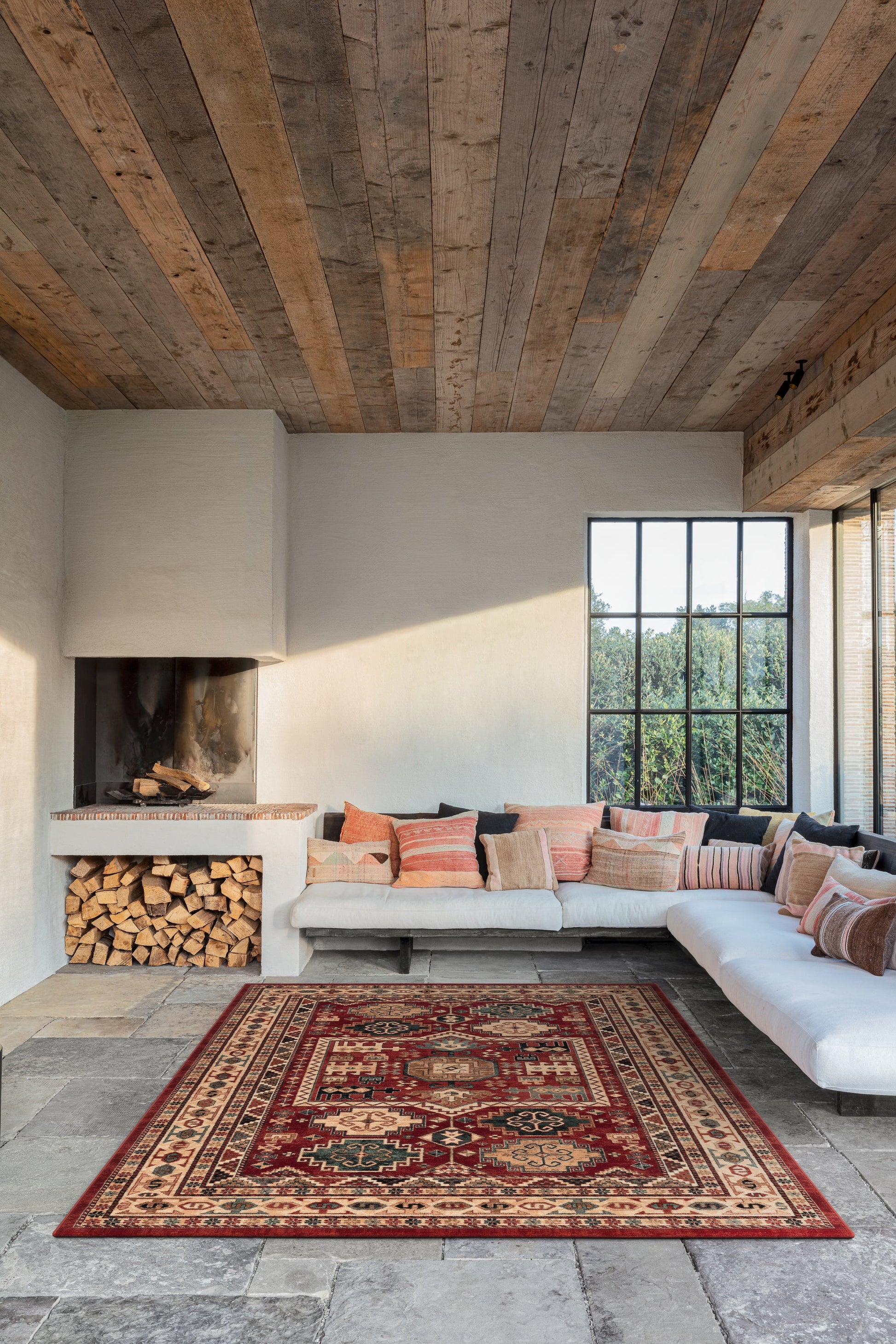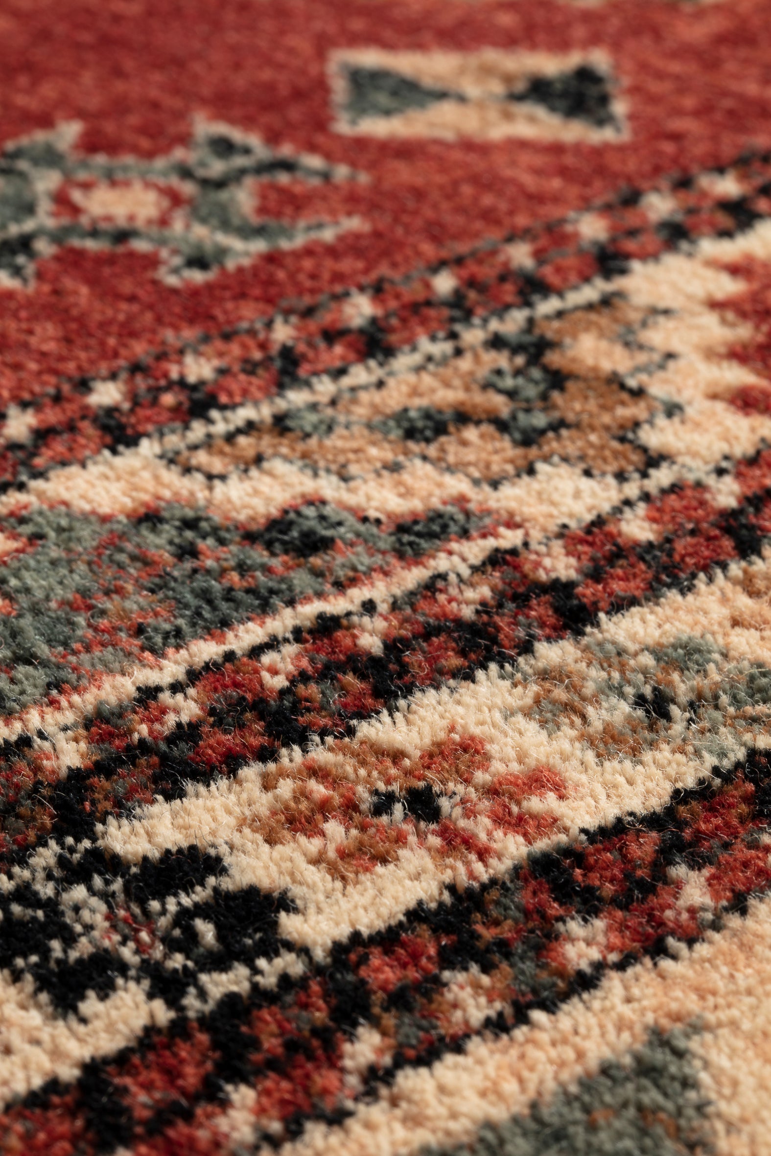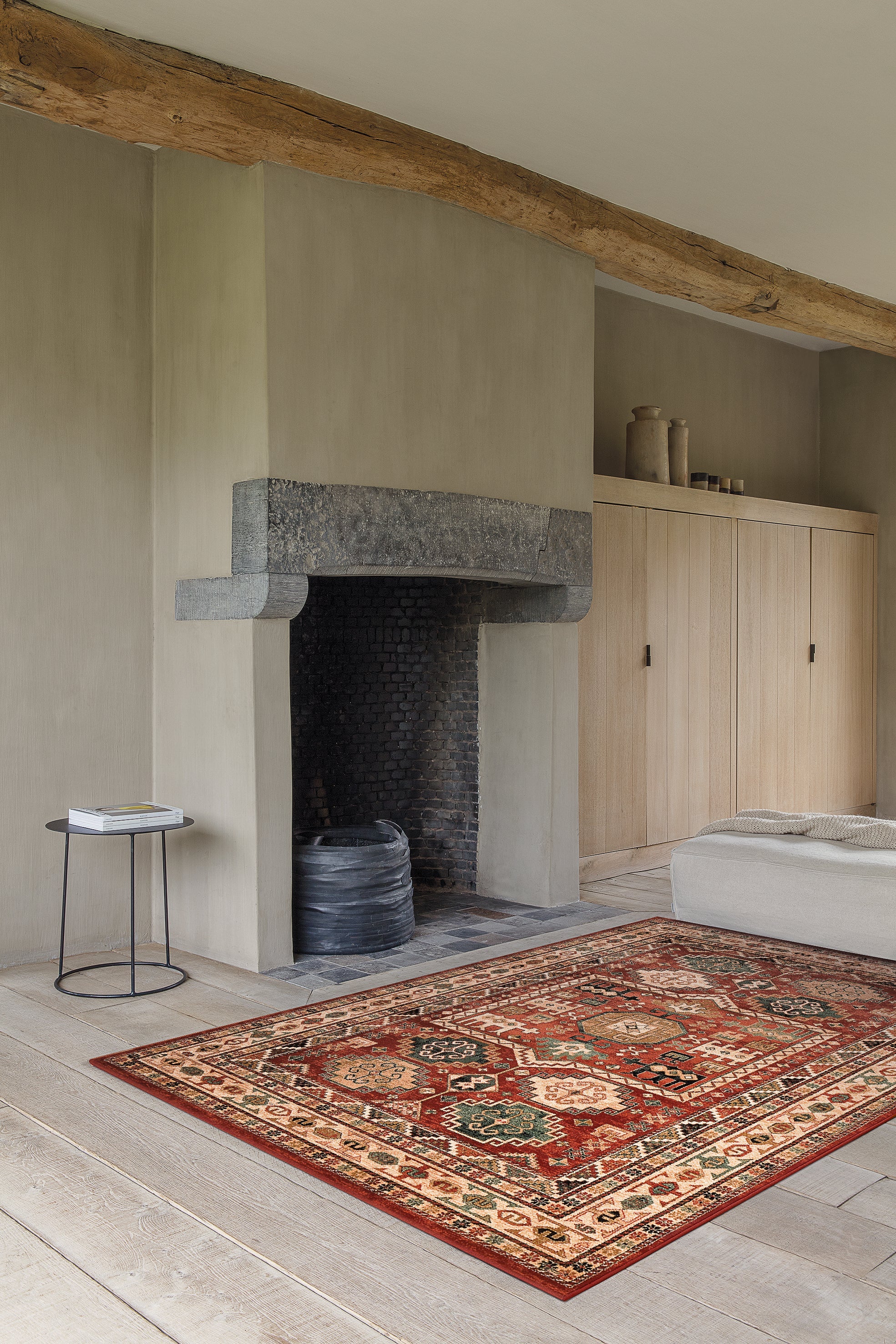 La base rouge chaleureuse et les accents beiges s’harmonisent avec le bois rustique, les tons terracotta et les meubles neutres. Il constitue une pièce maîtresse dans le salon ou la salle à manger, mais apporte également personnalité et profondeur dans une chambre ou un bureau.